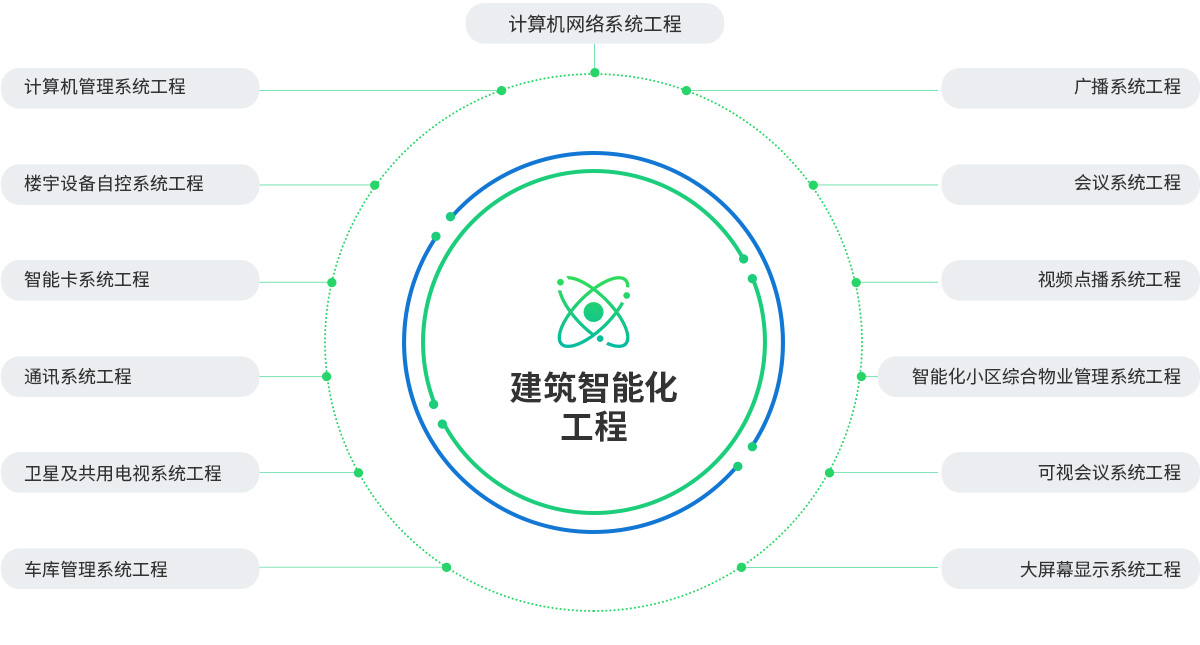電子與智能化設計與施工解決方案概述建筑智能化工程包括:計算機管理系統工程;樓宇設備自控系統工程;智能卡系統工程;通訊系統工程;衛星及共用電視系統工程;車庫管理系統工程;綜合布線系統工程;計算機網絡系統工程;廣播系統工程